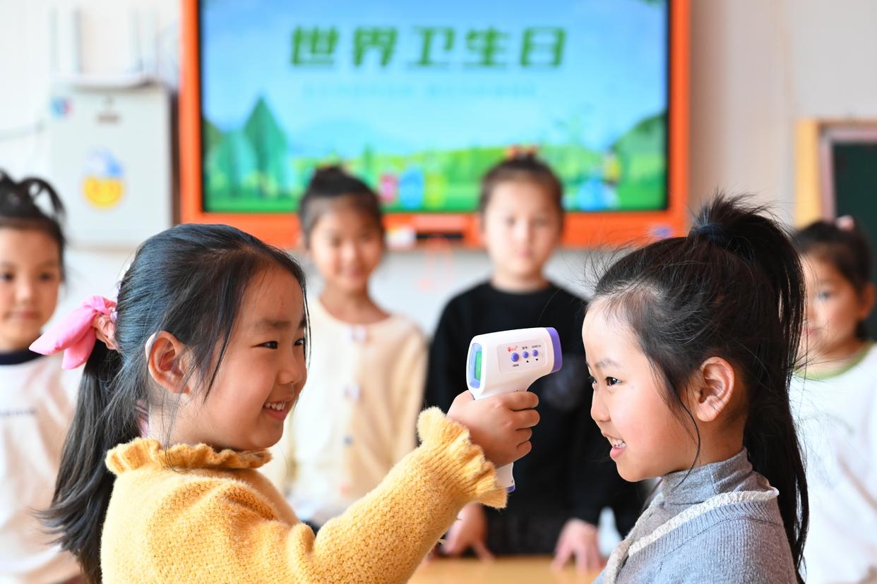 4月7日,在山东省滕州市西岗镇中心幼儿园,小朋友体验测量体温。新华社发(李志军摄)
