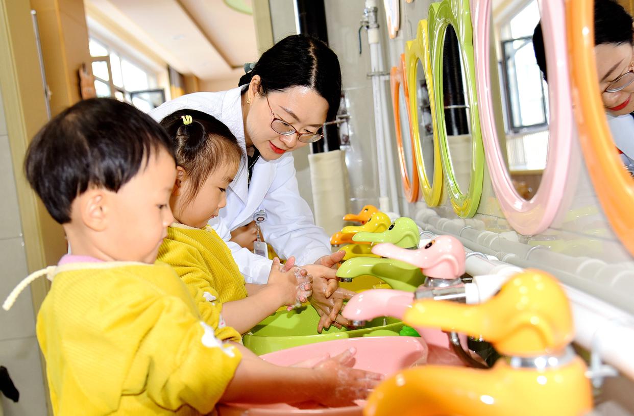 4月7日,在甘肃省平凉市静宁县妇幼保健院托育园,医务人员指导孩子们用“七步洗手法”洗手。新华社发(王毅摄)