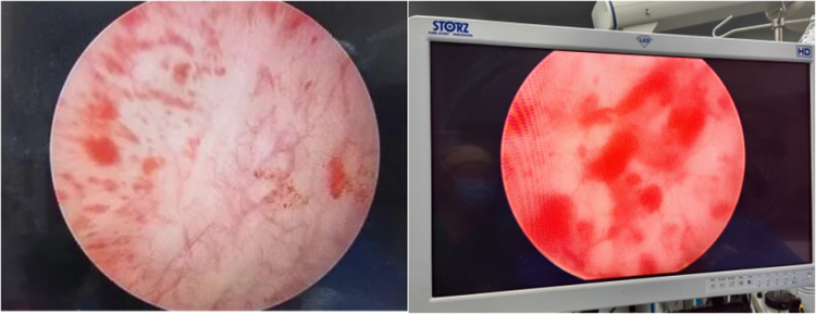 检查中,医生在静脉麻醉下向章女士膀胱内灌注生理盐水,当膀胱被充分撑开后,通过膀胱镜清晰看到,她的膀胱壁上布满了像雪花一样的毛细血管出血点,也就是医学上所称的Hunner's溃疡,这正是间质性膀胱炎的典型特征!