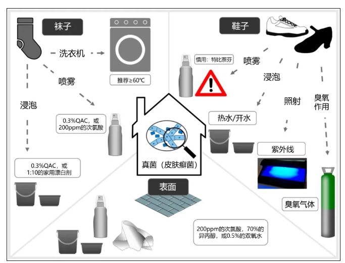 图1. 有真菌感染的家庭物品、物体表面、鞋袜消毒的方法总结表(要注意的是,不建议用特比萘芬等抗真菌喷雾,因为这可能会引起真菌耐药)(整理自参考资料)