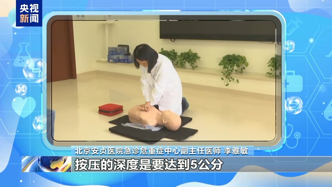 北京安贞医院急诊危重症中心副主任医师 李雅敏:评估的时候首先要在喉结旁开这一块触及颈动脉位置,同时看患者是不是存在呼吸停止的状态。施救的时候,通常要做的是胸外按压,要两掌相叠,掌根置于胸部中央,按压的深度要达到5厘米,频率要达到100到120次每分钟,这个时候肩手垂直往下按,通常要按30次,30次以后,要进行开放气道的动作。在开放气道之前,要评估病人是不是有口咽异物,要给他进行清理。清理完口咽异物以后,开放气道用仰头抬颏法,一个手掌按压他的前额,另外一个手掌帮他抬住下颌。开放完气道以后,进行两次的人工呼吸,整个的口要包绕患者的嘴部形成一个密闭的空间吹气。