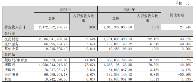 红星资本局注意到,2024年,该公司的销售量、生产量、库存量均较上年同期增加,公司解释为“主要受硫酸阿托品滴眼液获批上市影响”。2024年,滴眼剂收入首次超过其他产品收入总和,达到13.66亿元,同比增长106.08%;2025年,滴眼剂产品继续放量,同比增长42.76%。