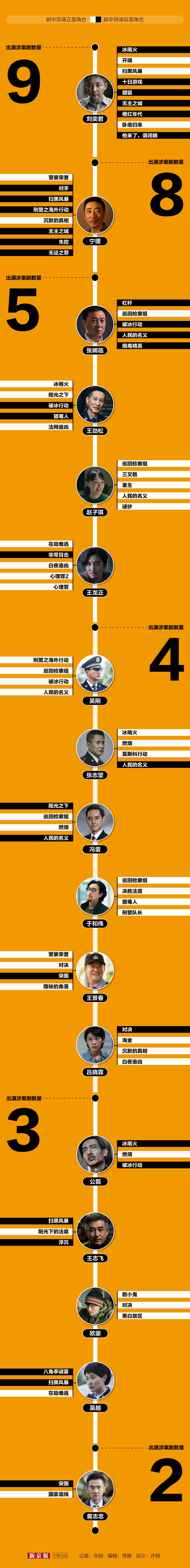 近日,随着现实题材禁毒剧《冰雨火》播出过半,埋藏暗处的毒枭“余总”终于浮出水面——正是刘奕君饰演的茶园主人杨兴权。“我就说刘奕君是内鬼吧!”“刘奕君、王劲松、张志坚必有一‘鬼’。”许多观众头头是道地分析着。早在《冰雨火》开播之初,王劲松饰演的云河县公安局局长林德赞,张志坚饰演的省公安厅禁毒总队副总队长陈力文,以及刘奕君饰演的杨兴权,都曾被观众“指认”为“内鬼”,甚至有观众总结出“刘奕君、王劲松、张志坚必有一‘鬼’”、“有刘奕君时,王劲松就是警察;没有刘奕君时,王劲松就是毒枭”的所谓反派定律。近年来,涉案剧在类型上持续“破冰”,题材呈多元化发展,但演员阵容却大有趋同之势。其中,刘奕君、王劲松、张志坚、宁理、吴越等演员纷纷成为涉案剧“熟面孔”,且他们驾驭的经典角色大多为复杂、多面的犯罪分子,以正与反的极致情感拉扯来体现人性为主要表达。这也令观众对这类演员先入为主产生了“反派滤镜”。新京报记者盘点了17位“涉案剧熟面孔”的作品、角色以及他们的“隐藏身份”,试图探寻所谓“反派定律”是否真的存在?“出圈”多是复杂人物,演员更看重人性表达
