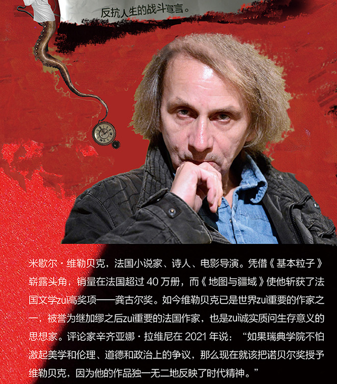 米歇尔•维勒贝克,是法国小说家、诗人、电影导演,凭借《基本粒子》崭露头角,销量在法国超过40万册,而《地图与疆域》使他斩获法国文学最高奖项——龚古尔文学奖。如今他已是世界最重要的作家之一,被誉为继加缪之后最重要的法国作家,也是最诚实质问生存意义的思想家。目前已有中文版《血清素》《反抗世界,反抗人生》等作品出版。