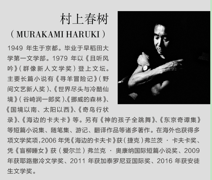 村上春树曾获得谷崎润一郎奖、每日出版文化奖、卡夫卡奖、耶路撒冷文学奖等世界范围内的诸多奖项。其短篇小说构思精巧,余韵悠长,给读者留下了丰富的解读空间。