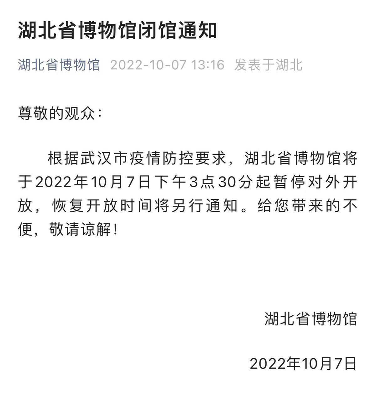 10月7日下午,湖北省博物馆发布闭馆通知,根据武汉市疫情防控要求,湖北省博物馆于7日下午3点30分起暂停对外开放,恢复开放时间将另行通知。