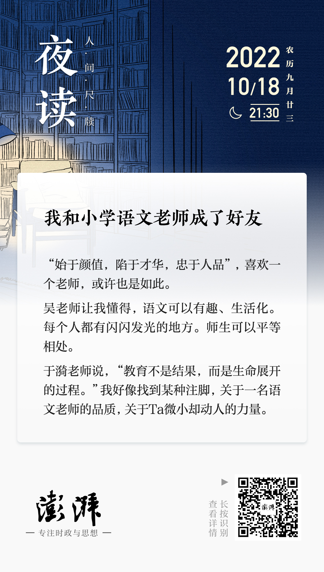 今天看到“人民教育家”、93岁的于漪老师的故事。她在办公室里用脸盆养鱼虾,只为培养一名学生的观察能力和自信,最终成功让学生对语文有了兴趣。她说,“教育从来就不是结果,而是生命展开的过程。”她说,自己就像钉在三尺讲台上的一柱红烛,那些许微光,在无限地延伸。