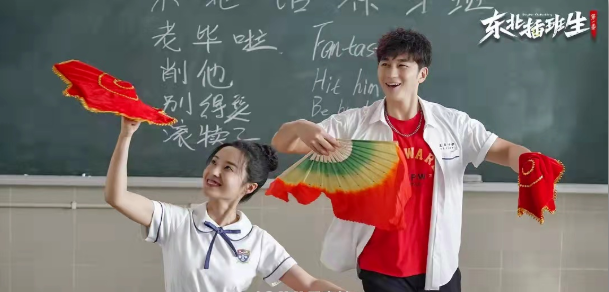 《东北插班生》的新鲜感就在于各种文化元素的大融合,比如不少角色的取名就撞梗港台偶像剧角色;王虎刚到学校见到冷脸霸气、操着港台腔的张文峰就给东北同学直播,这旮旯儿不就是道明寺的经典台词;剧中当然少不了东北二人转,外国学生来交流,王虎教给人家的是东北话和二人转《小拜年》……