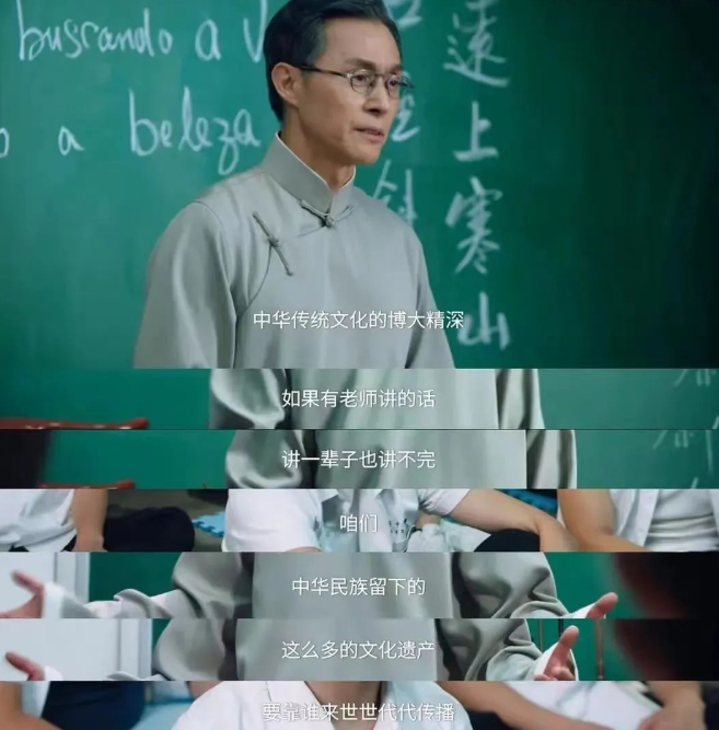 比如专门刻画了男主角的父子情,从父子隔阂到父子大和解,“亲人永远是你的后盾”的主题升华部分也比较感人;在师生情方面,该剧刻画了一位穿长衫的语文老师,语文老师钟爱传统文化,背得出《满江红》的王虎让他赞赏有加,语文老师以传播中华文化为己任,在教学中不让一个学生掉队,上完最后一堂课与讲台和学生鞠躬告别。