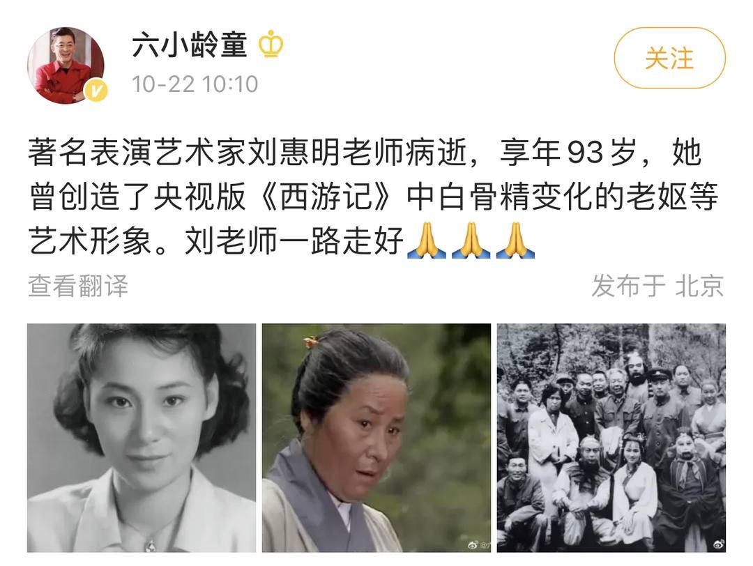 10月22日,演员六小龄童在微博发文悼念:“她曾创造了央视版《西游记》中白骨精变化的老妪等艺术形象,刘老师一路走好。”