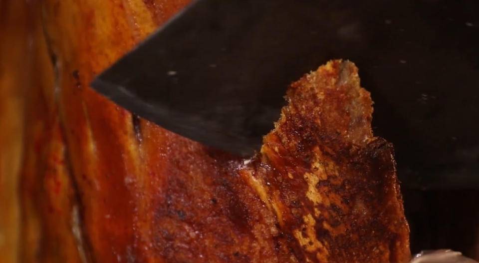 整猪烤制,外焦里嫩,再搭配上独家配料,一走进伍忠号黄家烤肉,独特的烤肉香味便直钻鼻腔,令人垂涎欲滴。迄今已有400多年历史的黄家烤肉,如今已经传到了第22代传承人黄宽的手上。