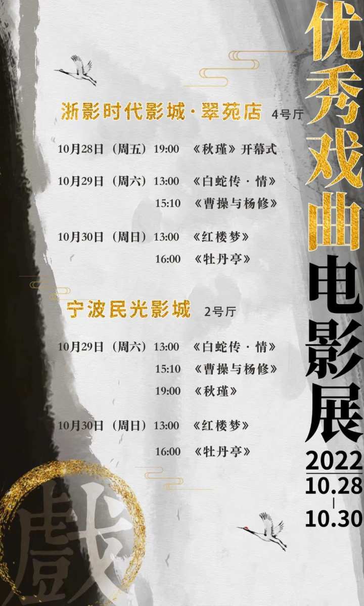 据悉,为加强传统文化在新时代的弘扬和传播,让更多观众走近戏曲,感受其独特魅力,浙江省电影放映协会联合杭州市曲艺家协会、杭州市戏剧家协会,组织了五部中国传统经典戏剧电影,于10月28日至30日在杭州、宁波两地举行优秀戏曲电影展映。