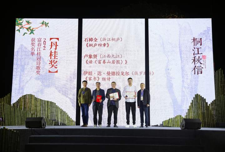 作为诗歌节的重要组成部分,“2022桐庐富春江桂冠诗歌奖”于10月23日晚颁奖。3个多月里,组委会收到来自北京、上海、新疆、西藏等全国各地的2139份投稿,经过专家层层评选,优秀诗歌作品脱颖而出。