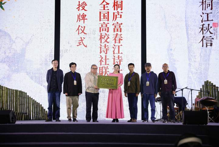 此外,桐庐富春江诗社与全国十所高校达成了“全国高校诗社联盟”,邀请诗歌学者、爱好者到桐庐人文山水走读。吉狄马加为桐庐富春江诗社社长舒羽授牌,高校学者上台见证。