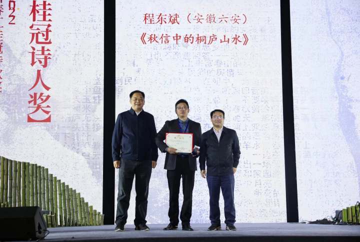 来自安徽六安的程东斌获“桂冠诗人奖”,来自湖北武汉的易浩、浙江湖州的石人、湖北武汉的夜鱼获得了“金桂奖”,桐庐春江小学的徐华伟等8人获得“最佳组织奖”。