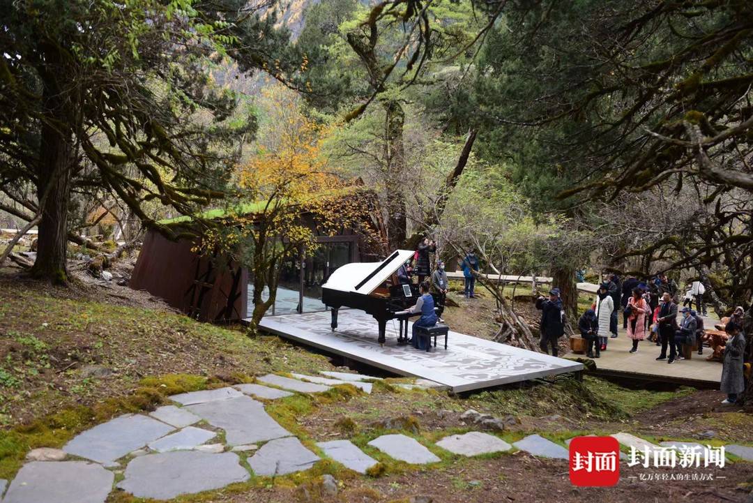 雅集除了要有好诗,也要有雅乐。讲座之后,阿来还和现场观众还前往了位于双桥沟景区内的森林音乐荟项目,一起欣赏了在森林里露天演奏的钢琴曲。林中千年古柏郁郁葱葱、四姑娘山特有的乔木沙棘环绕四周,树上成群的鸟儿嬉戏于林中,鸟啼与琴声水乳交融,让人陶醉于大自然诗情和天籁之音的美好中。