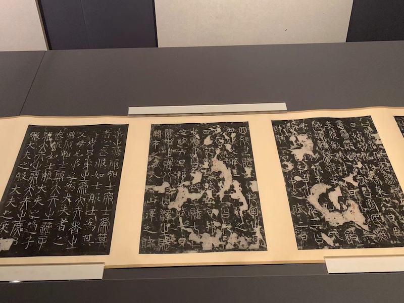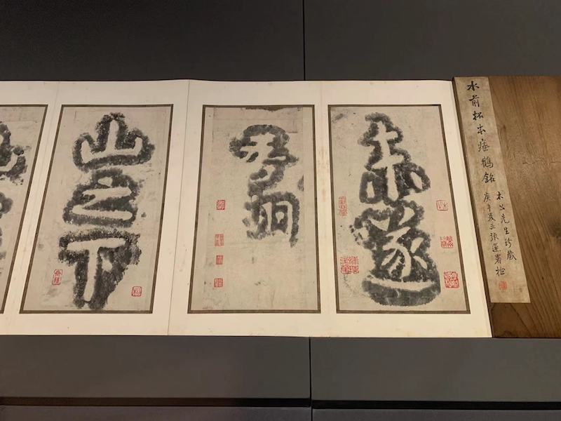 另一件重量级展品是《瘗鹤铭》水前拓本。《瘗鹤铭》原刻在江苏镇江焦山西麓崖石上。宋时被雷击崩落长江,石碎为五,北宋时,水退始现。清康熙五十一年(1712年)冬,原苏州知府陈鹏年募工移置山上,后砌入焦山定慧寺壁间。现存焦山残石计五块九十三字。所谓水前拓本即指康熙五十一年之前拓本。据介绍,水前拓本的传统鉴定方法是:中上石首行“未遂吾翔”之“遂”字走字底之长捺尚存,“吾”字第二横划及“口”部可见.“翔”字可见“羊”,部右点。