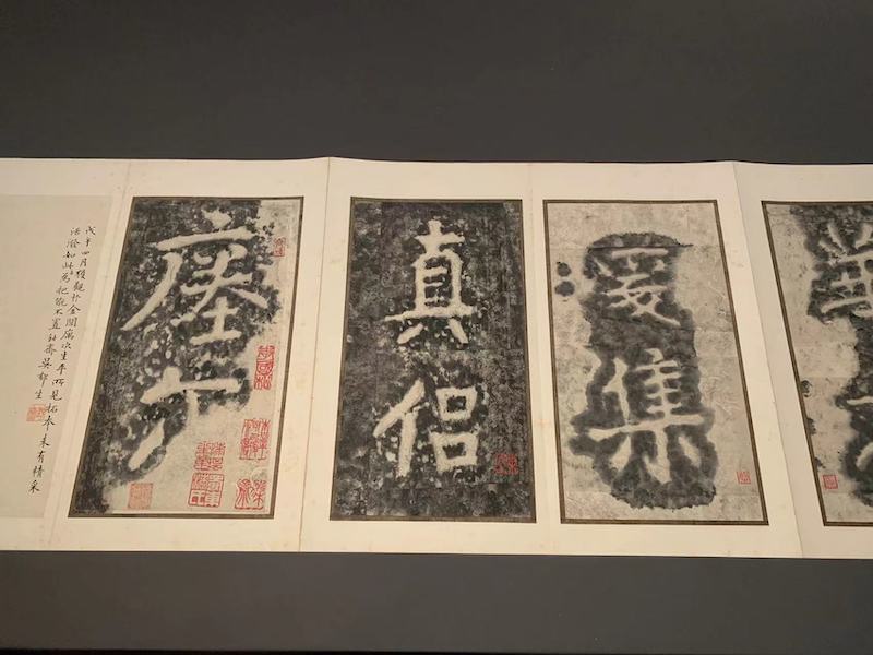 据介绍,拓本共计11开,册高39.3厘米,宽22.7厘米。碑文6开半,帖芯高32厘米,宽16.6厘米。在旧拓本首页,宋装旧书页浮置于新制底册上,由中缝及四角的丝线固定。此册外包有蓝色布套,楠木面板刻有赵之谦楷书,详细讲述了拓本的流传过程。