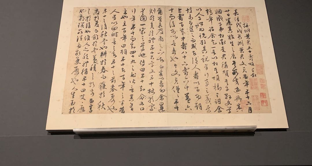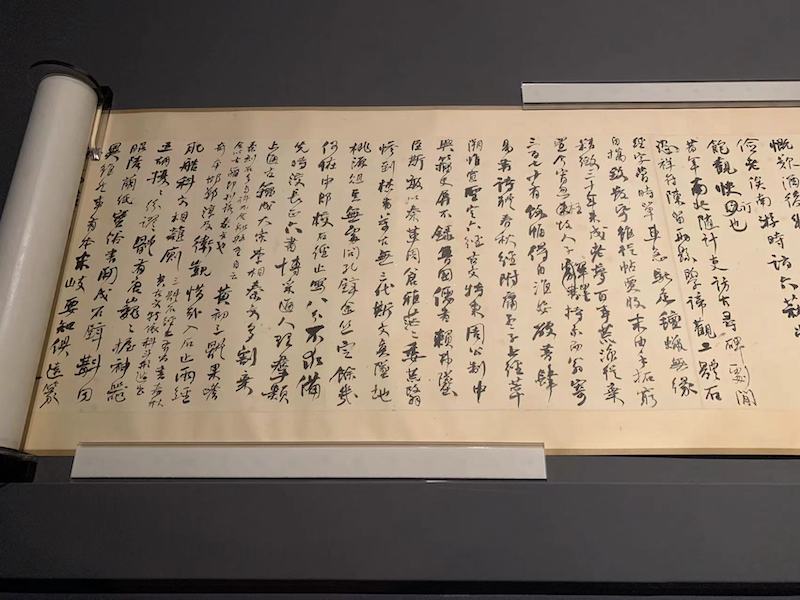 除了中心这八件展品,展厅中仍有不少值得细细品读的文物。比如入口处“纸间书写”板块展出了《文徵明诗文稿》,虽只打开一页,足见其书法流丽。目前上图藏文徵明诗文稿共七册。据清乾隆九年(1744)文徵明六世孙文含跋,其中三册文稿大约作于嘉靖十六年丁酉(1537)至十八年己亥(1539)也就是文徵明69至70岁时;后四册诗文稿有文徵明自题“甲寅、己卯、丙辰”六字,也就是嘉靖三十三年(1554)至三十五年(1556),文徵明85至87岁期间。