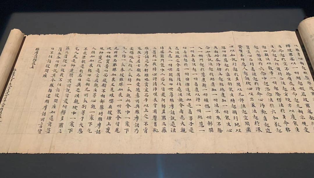 据介绍,《维摩诘经》卷子装,存上卷。共384行,行17字,分19纸,首残缺。在敦煌藏经洞被发现之前,存世的宋以前的古写本较少,而在敦煌经卷中,书写于五至六世纪,且明确有落款的古写本更是凤毛麟角。因为其年代较早,这卷《维摩诘经》更多保留了隶书的特点,因此在书法史上也有一定的地位,且对研究当时的造纸技术也具有很大的价值。