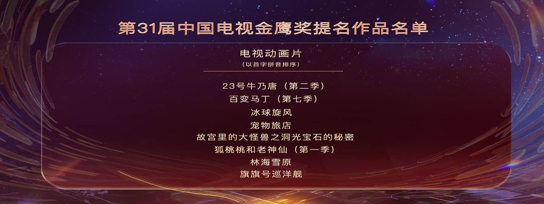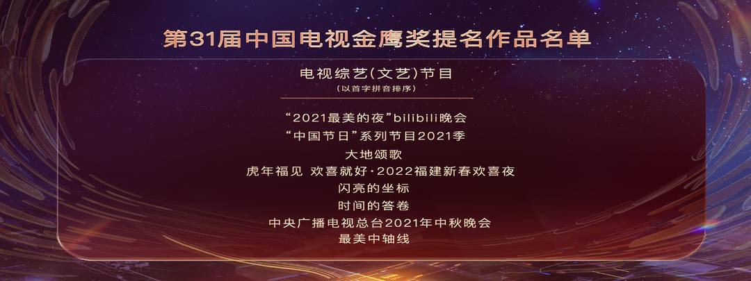 发布会上,公布了第31届金鹰奖提名作品,包括《阿坝一家人》《人世间》等36部电视剧,《百炼成钢:中国共产党的100年》《摆脱贫困》等15部电视纪录片,《“2021最美的夜”bilibili晚会》《大地颂歌》等8部电视综艺(文艺)节目,《23号牛乃唐(第二季)》《百变马丁(第七季)》等8部电视动画片。