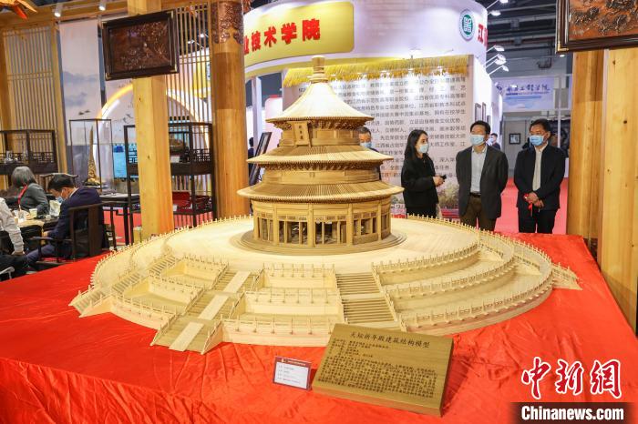 图为一些参观者在观看展出的一个天坛祈年殿建筑结构模型。 刘力鑫摄