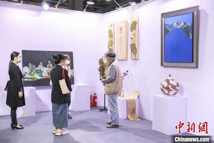 图为一位艺术家在给参观者介绍展出的作品。 刘力鑫摄