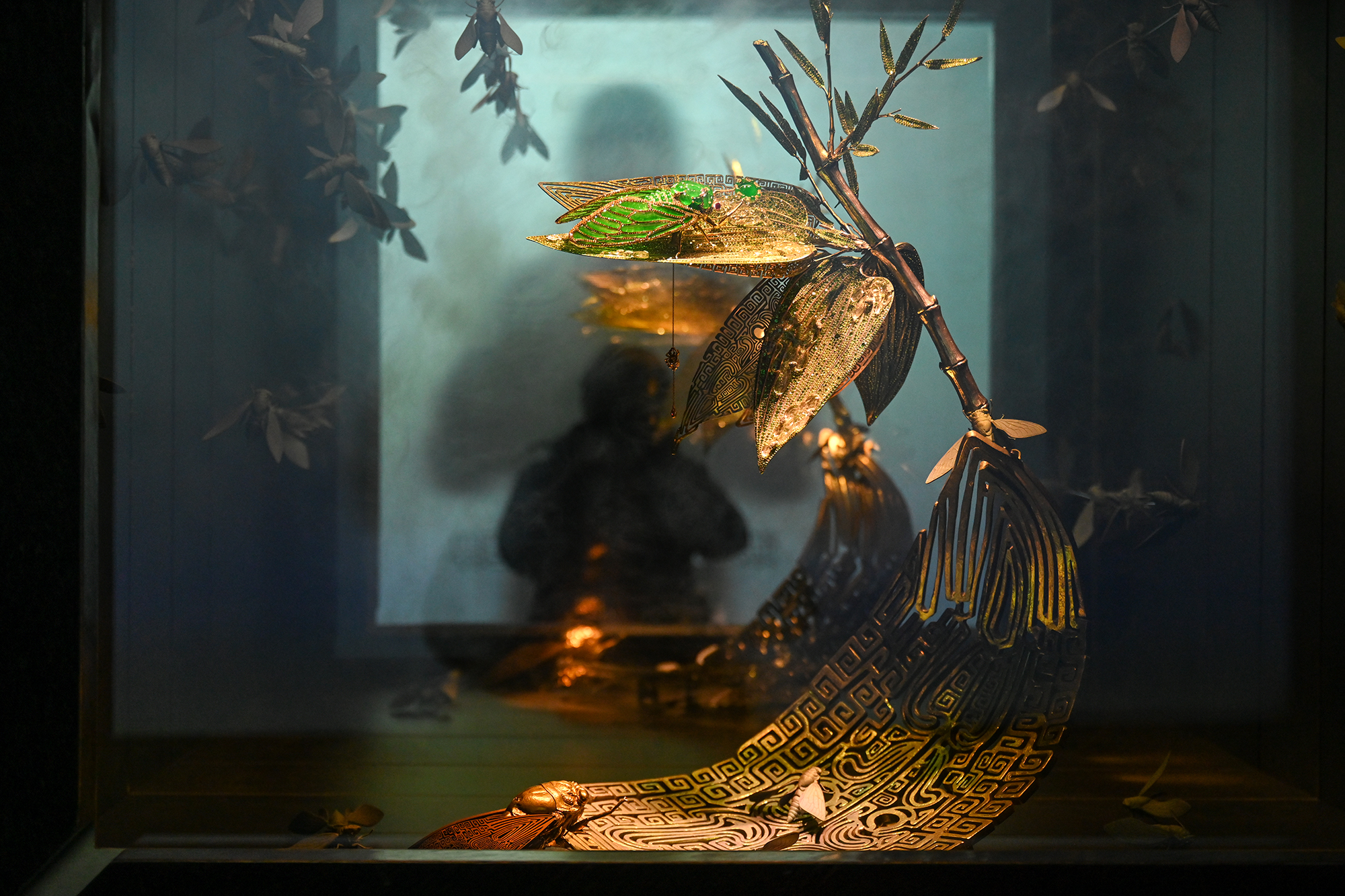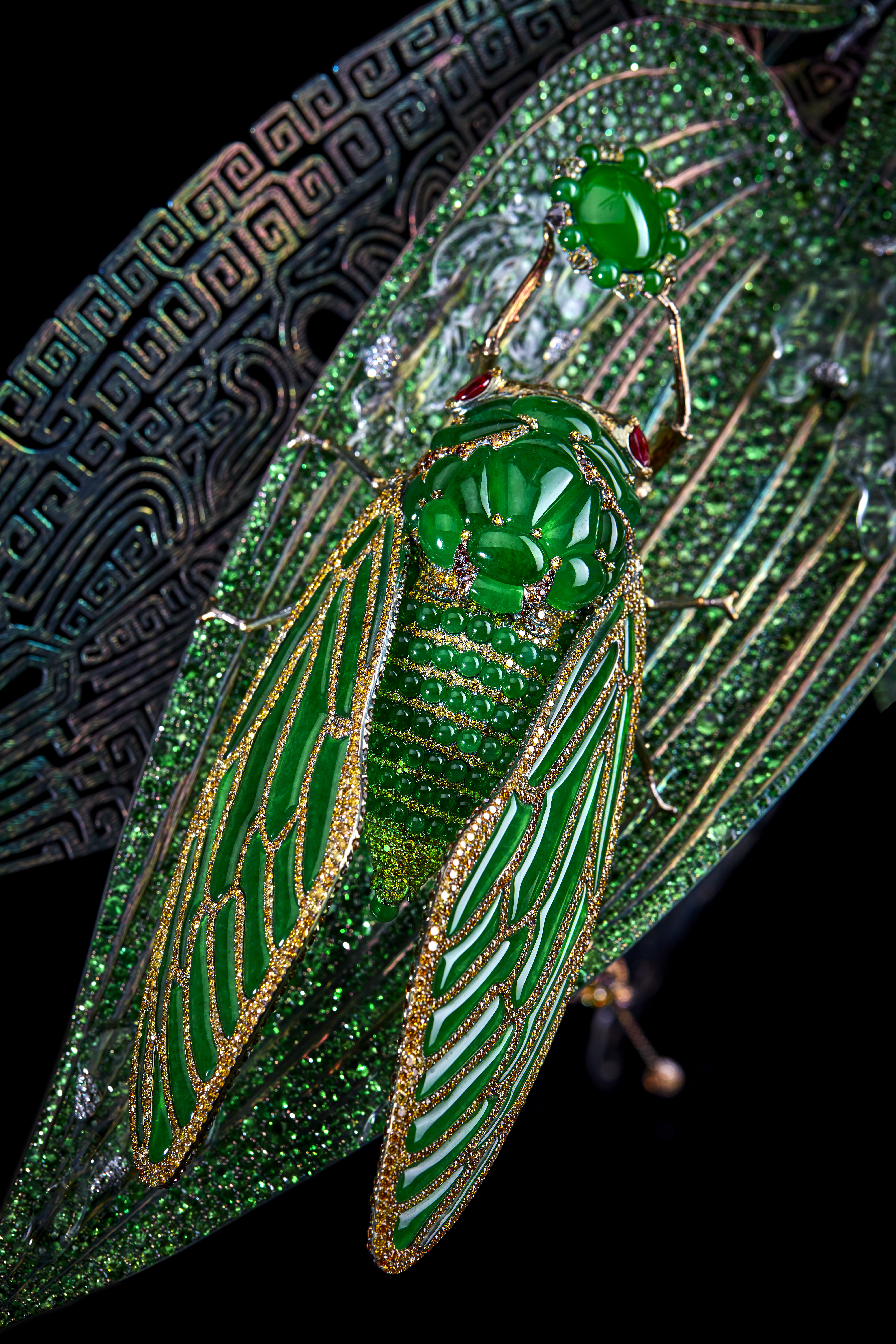 《悟禅知翠》中,蝉抱一颗帝王翡翠,背面镶一颗温润的紫罗兰翠玉。蝉身的翡翠圆珠,皆以“内格榫卯嵌接法”镶嵌,极薄的翅膀运用了陈世英2002年发明的“翡翠切割润光专利技术”。竹叶之上的图腾,参照商代铜器上的“蝉纹”雕刻,蜿蜒有致,互相连接扩展。