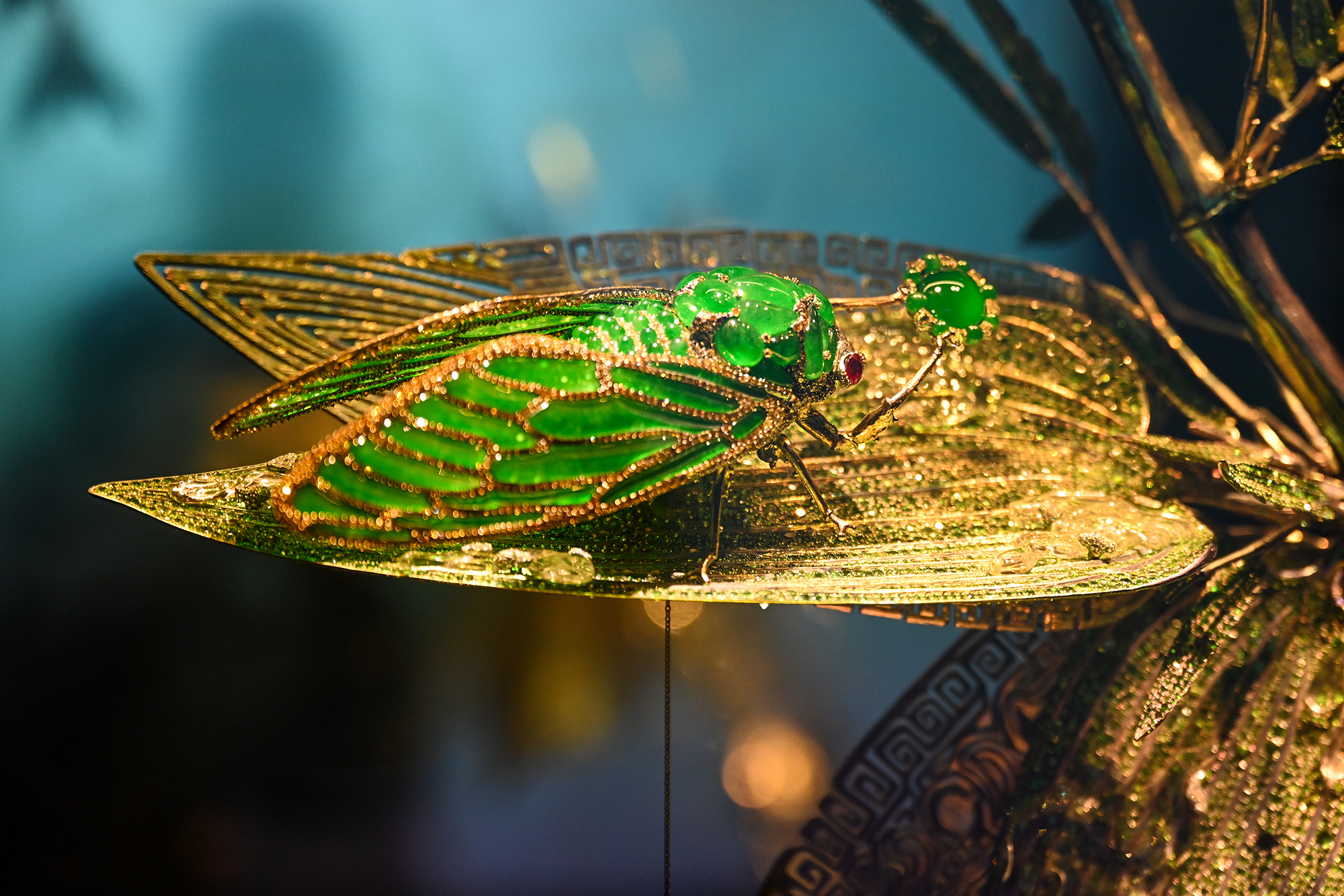 陈世英的这件《悟禅知翠》,“蝉”与“禅”同音,采用了帝王翡翠、帝王翡翠玉珠、紫罗兰翠玉、翡翠、红宝石、彩色钻石、彩色刚玉、翠榴石、水晶、18K白金、钛金属等珍稀材料。受访者供图
