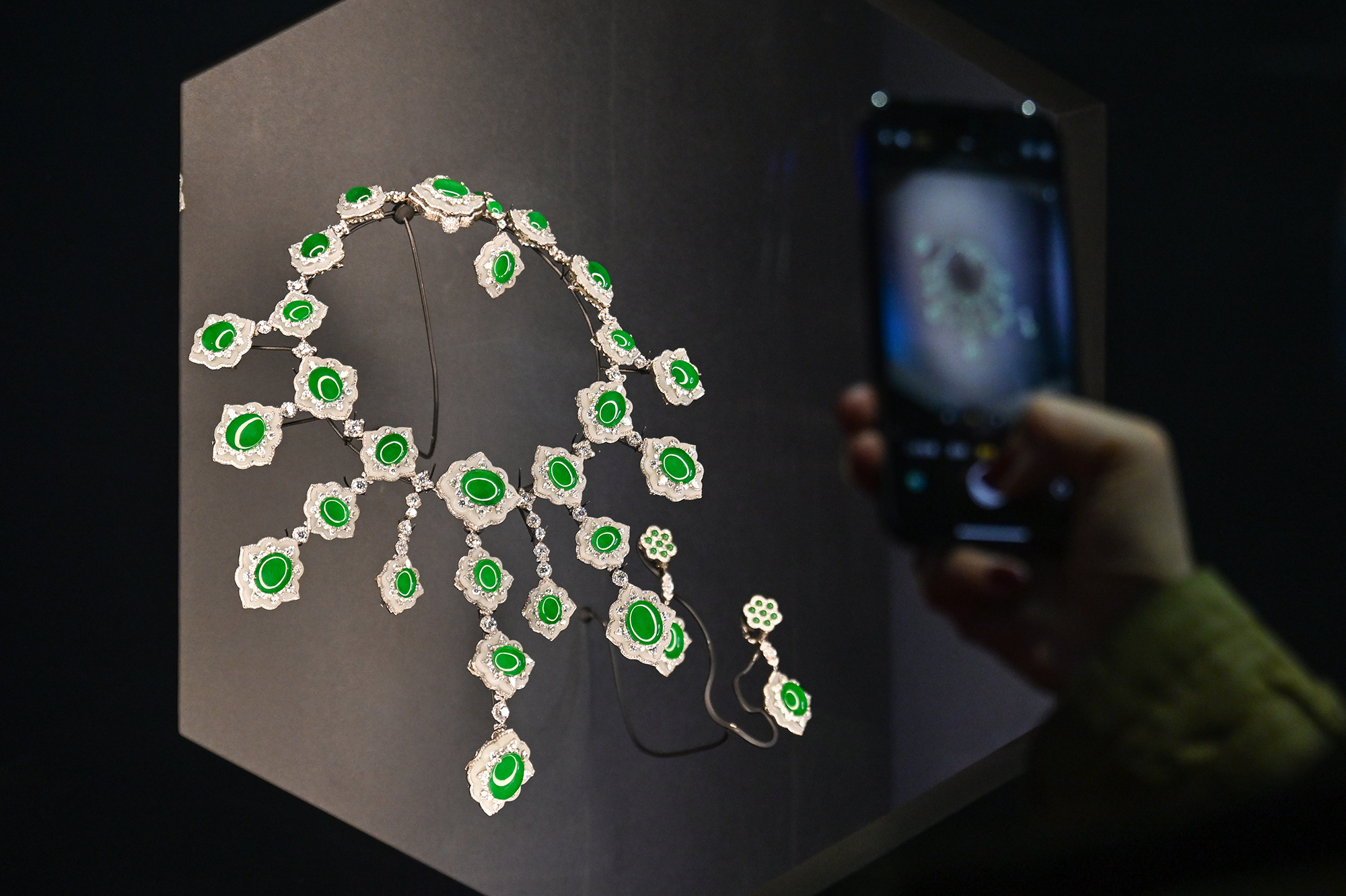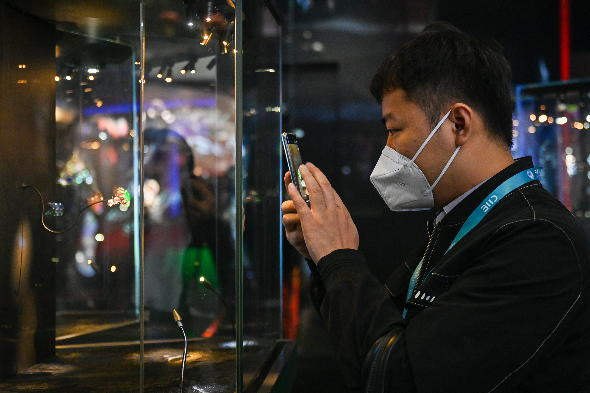 由香港起飞运抵上海浦东国际机场的《悟禅知翠》等25件珍稀珠宝艺术作品是进博史上申报价值最高的展品,总价值约5.6亿元人民币。