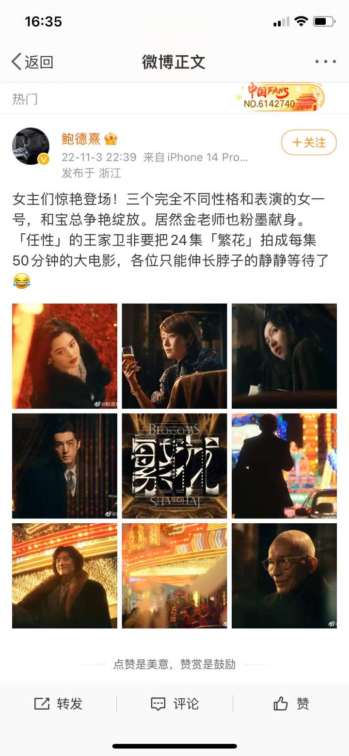 “女主们惊艳登场!三个完全不同性格和表演的女一号,和宝总争艳绽放。居然金老师也粉墨献身。‘任性’的王家卫非要把24集《繁花》拍成每集50分钟的大电影,各位只能伸长脖子静静等待了。”