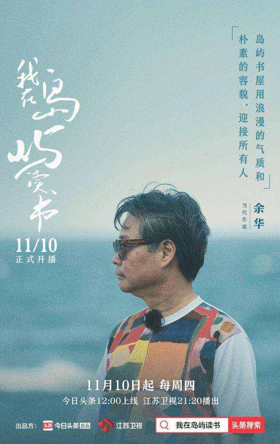还有一个是《我在岛屿读书》,11月10日播出。今日头条和江苏卫视联合出品,京东冠名。节目海报上的介绍是“余华首部外景纪实节目”。