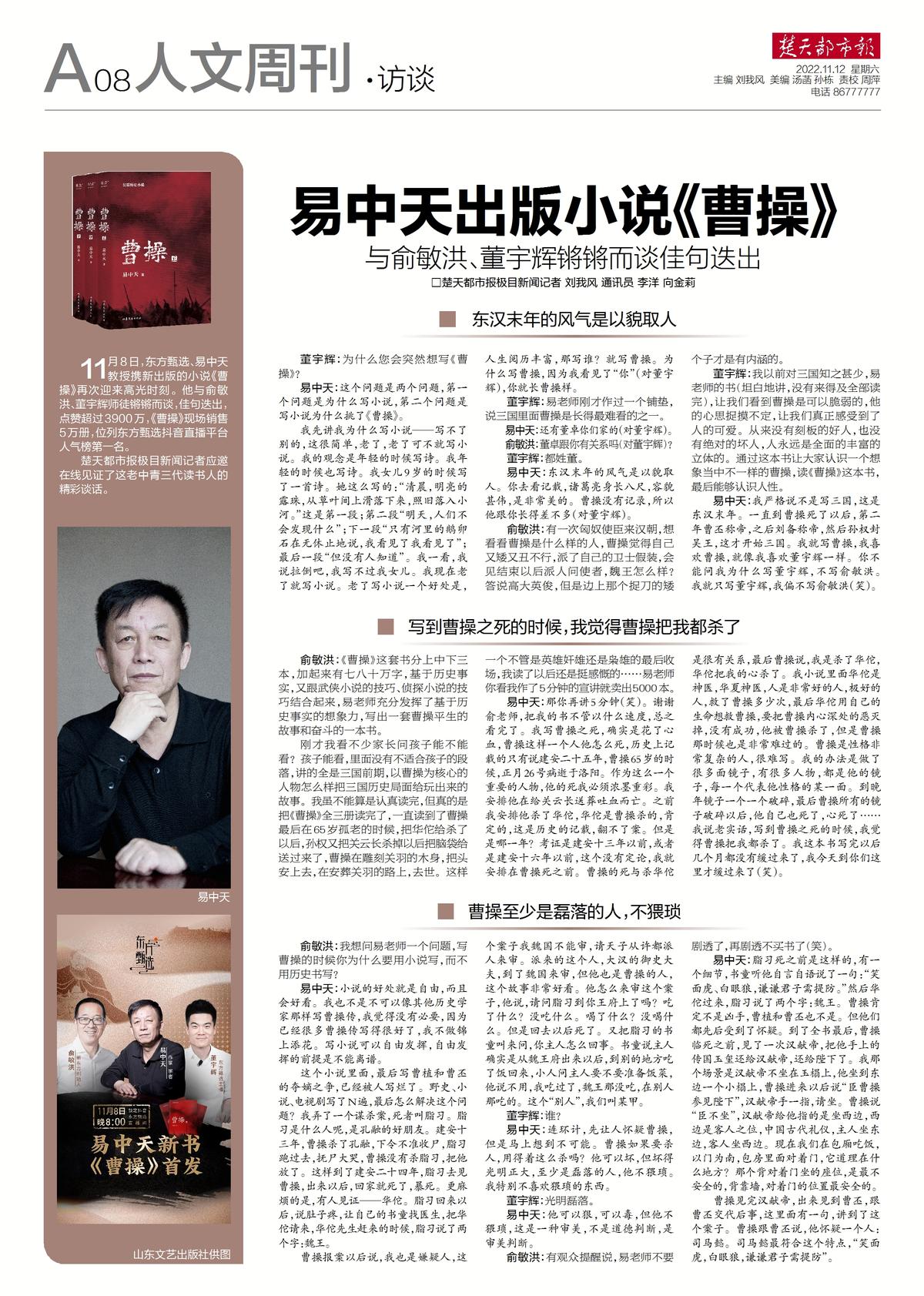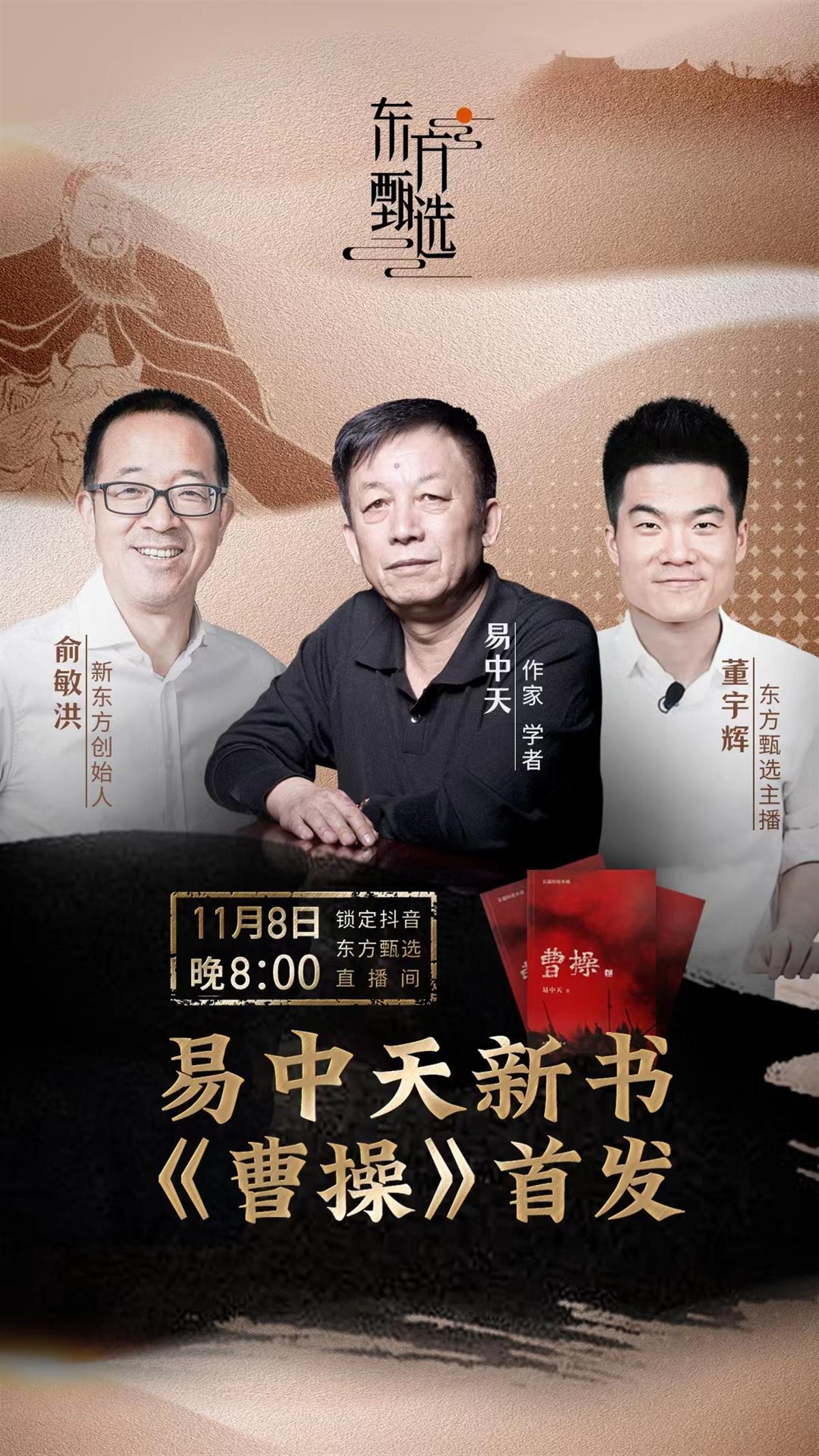 11月8日,东方甄选,易中天教授携新出版的小说《曹操》再次迎来高光时刻。他与俞敏洪、董宇辉师徒锵锵而谈,金句叠出,点赞超过3900万,《曹操》现场销售5万册,位列东方甄选抖音直播平台人气榜第一名。