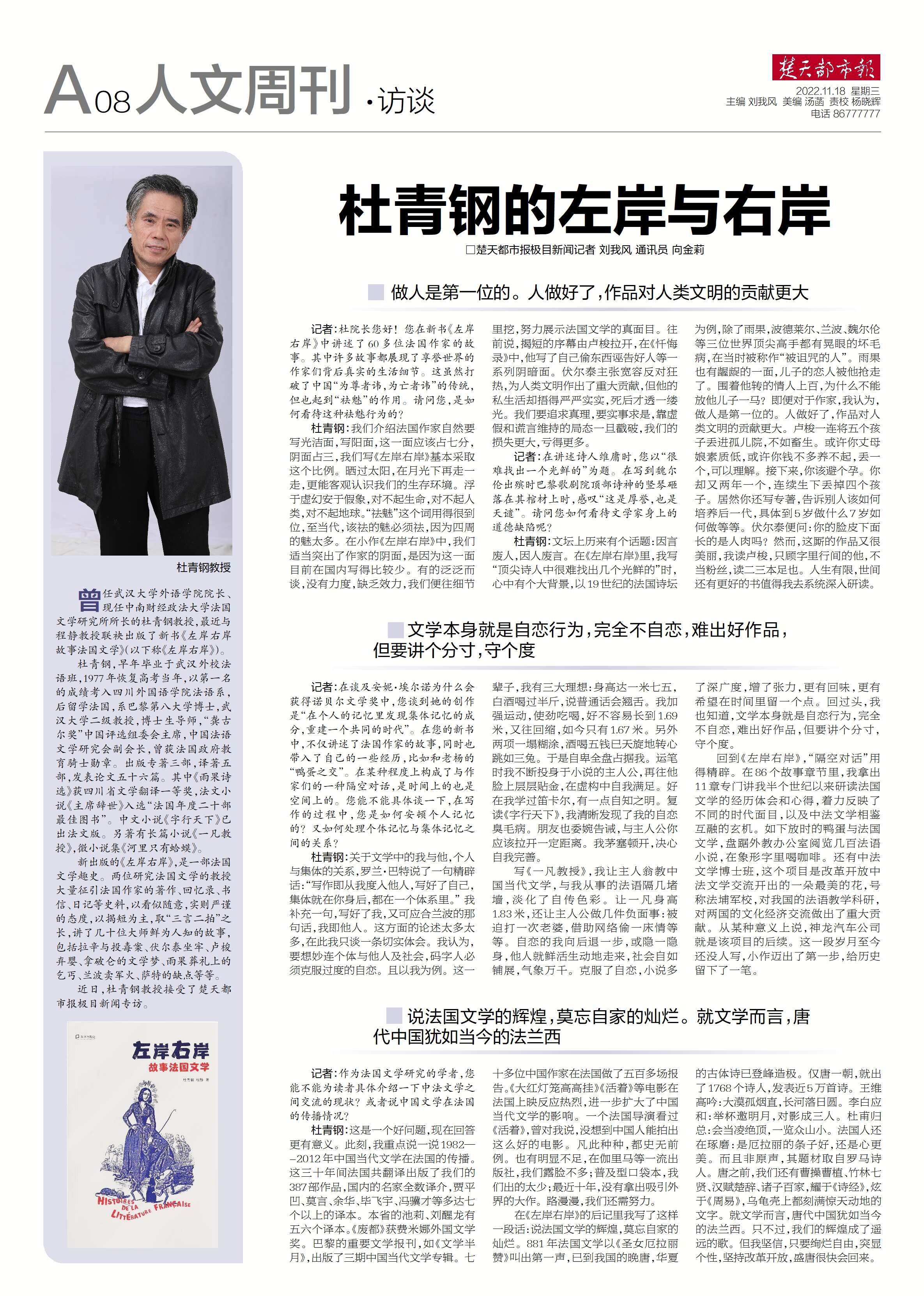 曾任武汉大学外语学院院长、现任中南财经政法大学法国文学研究所所长的杜青钢教授,最近与程静教授联袂出版了新书《左岸右岸 故事法国文学》(以下称《左岸右岸》)。