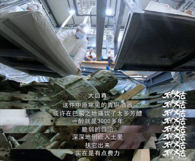 片子开头就展示了在三星堆遗址考古大棚内K8祭祀坑,一件青铜大口尊的提取过程,原来考古也是有职业病的。沉浸在19平方米的方坑里,趴在坑底紧锣密鼓地开展发掘工作,实际是很辛苦的一件事情。尽管趴在升降板上是工作舱内的考古人们唯一可以让身体得到放松的姿势,但在文物出土时,身在升降板上的他们没有很好的发力点,沉重的青铜器给他们的腰腹带来不小伤害。可能对文物各种五花大绑,再发力,半天纹丝未动。从趴姿到起身,也在消耗膝盖的生命力。一位考古人员边工作边吐槽说,“这完全是练腰腹力量,我已经腰疼得快断了。”穿着防护服,背上已经被汗湿透。90后考古女孩何晓歌带伤上阵自创圆规式起立动作,并表示自己的伤不算什么,自己的老师甚至软骨都被磨没了。