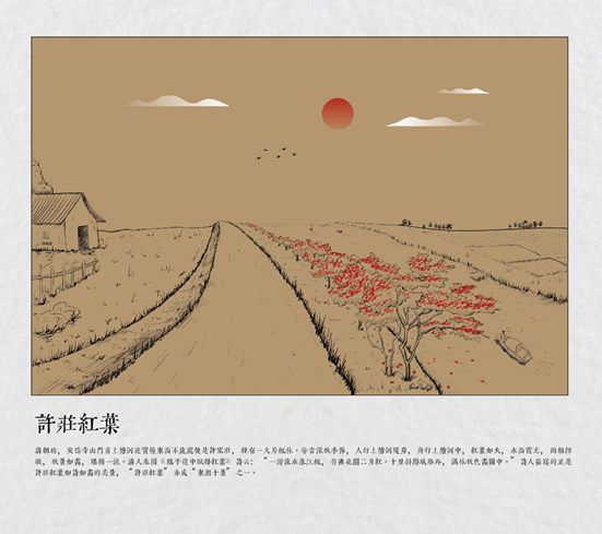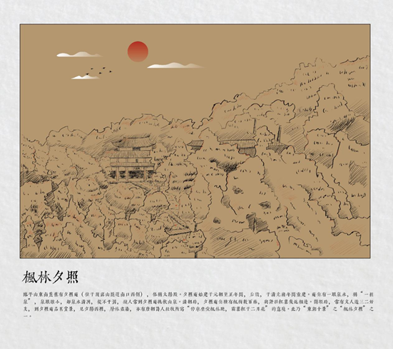 枫林夕照:临平山东南麓旧有夕照庵(位于现邱山隧道南口西侧),俗称太阳殿。夕照庵始建于元朝至正年间,后毁,于清光绪年间重建。庵旁有一眼泉水,称“一担泉”,泉眼虽小,却泉水清冽,从不干涸,镇人常到夕照庵挑饮山泉。清朝时,夕照庵旁种有枫树数百株,与许庄红叶几近相连。闲暇时,常有文人邀三二好友,到夕照庵品茗赏景,见夕阳西照,层林尽染,亦有唐朝诗人杜牧所写“停车坐爱枫林晚,霜叶红于二月花”的意境。此乃“东湖十景”之“枫林夕照”也。