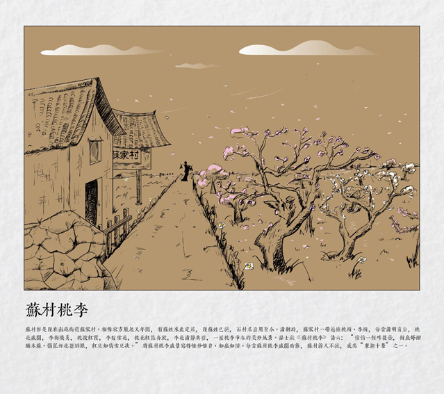 苏村桃李:苏村即是现在南苑街道苏家村。相传宋方腊起义年间,有苏姓来此定居,现苏姓已绝,而村名沿用至今。清朝时,苏家村一带遍植桃树、李树,每当清明前后,桃花盛开,李树飞英,桃披红霞,李绽雪花,桃花红艳奔放,李花清静典雅,一派桃李争春的美妙风景。孙士毅《苏村桃李》诗云:“愔愔一径叫提壶,树底蜂酣睡未苏。恼乱好花迴醉眼,红儿如倩雪儿扶。”将苏村桃李盛景写得惟妙惟肖、如痴如醉。每当苏村桃李盛开时节,苏村游人不绝,成为“东湖十景”之一。