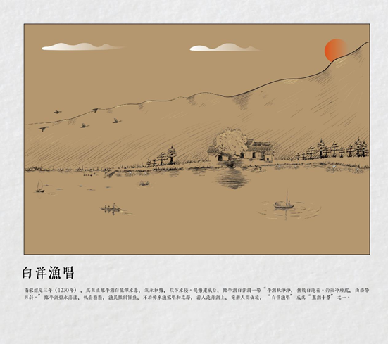 白洋渔唱:南宋绍定三年(1230年),为阻止临平湖白龙潭水患,筑永和塘,以防水侵。堤塘建成后,临平湖白洋涧一带“平湖秋渺渺,无数白莲花。钓艇冲烟处,山桥带月斜。”临平湖碧水荡漾,帆影点点,渔民撒网捕鱼,不时传来渔家唱和之声,游人泛舟湖上,宛若人间仙境,“白洋渔唱”成为“东湖十景”之一。