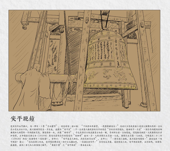 安平晚钟:进安隐寺山门路口,有一牌坊。上书“贡山灵秀”,两边题有一副石联:“千秋标格供清赏,一代繁华剩劫余。”沿林荫小道走约五十米,便可看到寺院前一方泉池,池壁刻“安平泉”三字。北宋诗人苏轼游安隐寺时感叹“当年陆羽空收拾,遗却安平一片泉”。安隐寺内建有弥勒佛殿和大雄宝殿。寺内绿地宽阔,东有唐梅一本,西建“香雪亭”,亭北栽黄杨古树及罗汉古松各一棵,寺四周古樟、古松环抱,环境极为幽深。大殿东侧为僧房和客堂,正中悬挂康有为游安隐寺时书写的“真如堂”匾额一方。大殿西侧以木架搁一大鼓,东侧以木架悬一大铁钟,乃明万历二十二年(1594年)所铸。沈谦曾作《铸钟诗》,首句曰:“安平池前人如林,洪钟高峙青山岑”,末句云:“一声识尽江南晓,落月疏星噪寒鸦。”清俞泰枢《安平晚钟》诗云:“隐隐钟声云外出,凌空幢影照苔痕。两行古木开山径,一道清泉对寺门。”每当夜气方清,万籁俱寂之时,安平晚钟敲响,山回谷鸣,钟声悠远清扬,远飘三里之外人烟密密之临平,“东湖十景”之“安平晚钟”一景由此而成。