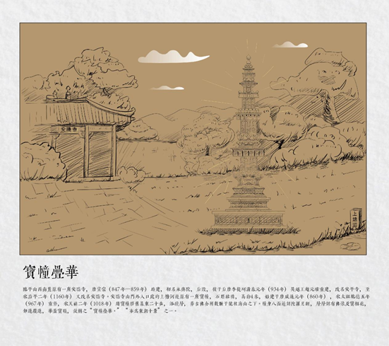 宝幢叠华:临平山西南麓原有一座安隐寺,唐宣宗(847年—859年)时建,初名永兴院,后毁,复于后唐李从珂清泰元年(934年)吴越王赵元瓘重建,改名安平寺,至宋治平二年(1160年)又改名安隐寺。安隐寺山门外入口处的上塘河边原有一座宝幢,石塔结构,高约4米,始建于唐咸通元年(860年),宋太祖乾德五年(967年)重修,宋天禧二年(1018年)将宝幢移旧基东二十步,添续层,葬古佛舍利数颗于龙柱海山之下。幢身八面遍刻陀罗尼经,层层刻有佛像及宝相花,仰莲覆莲,华盖宝顶,故称之“宝幢叠华。”亦为“东湖十景之一。
