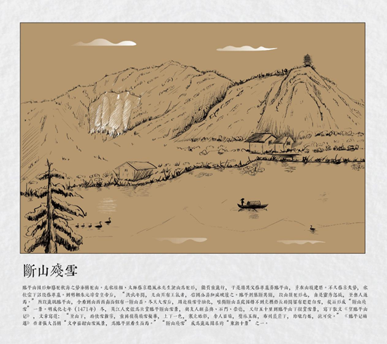 断山残雪:临平山因形如骆驼饮海之势亦称驼山。北宋权相、太师蔡京听风水先生说山为驼形,能负重远行,于是将其父蔡准墓葬临平山,并在山顶建塔。不久蔡京失势,宋钦宗下诏毁蔡准墓。到明朝朱元璋当皇帝后,“洪武年间,凡山川有王气者,信国公汤和咸破坏之。临平则凿断其颈,以山类驼形也,由是灵秀忽灭,至无人通焉。”所以远眺临平山,会看到山西西南面似有一断山岙。冬天大雪后,周边积雪皆融化,唯独断山岙处因得不到光照仍长时间留有皑皑白雪,从而形成“断山残雪”一景。明成化七年(1471年)冬,吴江人史鉴为欣赏临平断山雪景,与友人经嘉兴、石门、崇德,又行五十里到临平山下观赏雪景,写下散文《望临平山记》,文章写道:“至山下,时快雪新霁,重冈复岭积雪凝华,上下一色,寒光皓彩,夺人目睛,琼林玉树,布列岩崖下,玲珑玓烁,绝可爱。”《临平记补遗》作者张大昌称“文中描绘山雪风景,为临平别看生面焉。”“断山残雪”成为远近闻名的“东湖十景”之一。