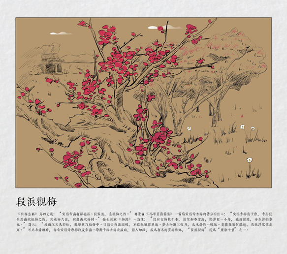 段浜观梅:《杭县志稿》卷四记载:“安隐寺南有扫花居、段家浜,系植梅之所。”姚景瀛《珍帚斋诗画集》一首写安隐寺古梅的诗后有注云:“安隐寺梅栽于唐,寺南段浜为南宋植梅之所,其花亦六出,与超山宋梅同。”孙士毅在《梅渡》一诗注:“段村古梅数千本,弥望如香雪海,隔岸舣一小舟,花时竞渡,亦春游韵事也。”诗云:“烟雨江天失彩虹,数声欸乃暗香中。只愁云向溪头破,不信春须驿里通。梦去冷锄三径月,北来斜倚一帆风。蹇驴策策何能遍,我欲浮家住水东。”可见在清朝时,每当安隐寺唐梅以及寺南一带数千株古梅花盛时,游人如织,成为有名的赏梅胜地,“段浜观梅”遂为“东湖十景”之一。