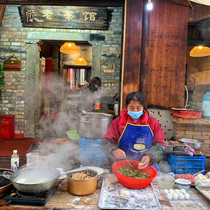 我把自己藏一群早茶客之中,看茶香葳蕤着生命,看着一腔热情的一个个大锅,燃烧着小吃的清香,在古镇的天空丝丝绕绕,飘摇。
