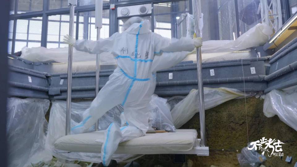 纪录片中可以发现,三星堆考古遗址上伫立着一幢幢钢架玻璃工作舱,考古人们需要在这些舱内完成文物发掘、取样等高强度的工作。为了保证文物们不会被污染,所有下到探坑内的人都要穿上整套防护服全副武装,长时间保持俯卧的姿势与三星堆土壤之下的器物们完成“亲密接触”。特有的工作方式亦给考古工作人员的身体造成了不可逆转的伤害,带伤上阵的90后女孩何晓歌却自创“圆规起立”的方式坚守一线。