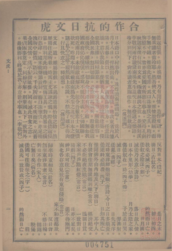 文虎一道,虽属游戏,不过为遣兴怡情之助,然历稽往史所载,时寓主文谲谏之义。际兹倭寇侵暴,得利用此时机,作宣传工具,对此暴日之横行恣肆,纵未能声罪致讨,而口诛笔伐,亦足稍洩胸中郁愤。(李敬何)