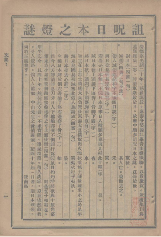 1931年的农历八月,正值“九·一八”事变前夕,新出版的上海《文虎》杂志(第2卷第15期)刊登有《诅咒日本之灯谜》一文,作者钱南扬在文中讲起四十年前的一桩往事:“清德宗光绪二十年,慈禧诞辰,嘉善令婺源江峰青出灯征联,以为庆贺,厥后集刊为《莲廊雅集》二卷。时清军新败于日,故书中多诅咒日本之谜。”钱氏从《莲廊雅集》中录出十一条灯谜,皆有檄讨、咒诅日本之意,如“将日本挖去心肝(字一):‘呆’”,“拿获日本将放倒,左边抽了筋,右边穿了骨(字一):‘相’”等等。