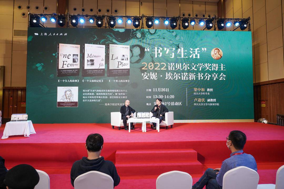 今年10月6日,瑞典文学院将2022年诺贝尔文学奖颁给了法国女作家安妮·埃尔诺。消息传来之后,安妮·埃尔诺的文学作品也成为读者瞩目的一个焦点。11月26日下午,“书写生活——2022诺贝尔文学奖得主安妮·埃尔诺新书分享会”在天府书展上举行。四川大学哲学系教授梁中和、四川大学文学与新闻学院副教授卢迎伏,围绕安妮·埃尔诺三本中文版新书展开分享他们各自感受到的安妮·埃尔诺乃至法国当代文学魅力。