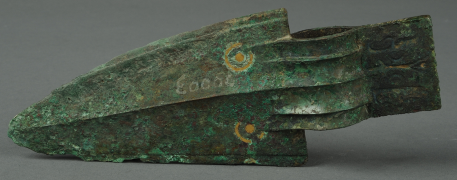 长25厘米、宽9.02厘米。戈体宽厚,援部舌条状,基本对称,呈等腰三角形,中间起脊,无胡无穿,銎内。銎部饰椭圆形瓦纹,内尾部等宽平齐,平齐处正反两面各有一铭文和花纹,在戈的援末与銎内相接处,正反两面分别装饰两个金光灿然的错金环形目状纹饰,因此称之为错金目纹铜戈。原收藏者为此器配一长方形布面盒,盒面左上角竖排书写“商句兵”三字,右下一行中间几字已模糊,似“爵斋所藏精品”字样。此戈铜质较好,加工方法有特殊之处,器物本身及形制、铭文都很有特点,同形制者极为少见。距今虽已3000多年,器体锈蚀,刃一侧也有残缺,但纹饰华美,错金处依然熠熠生辉。