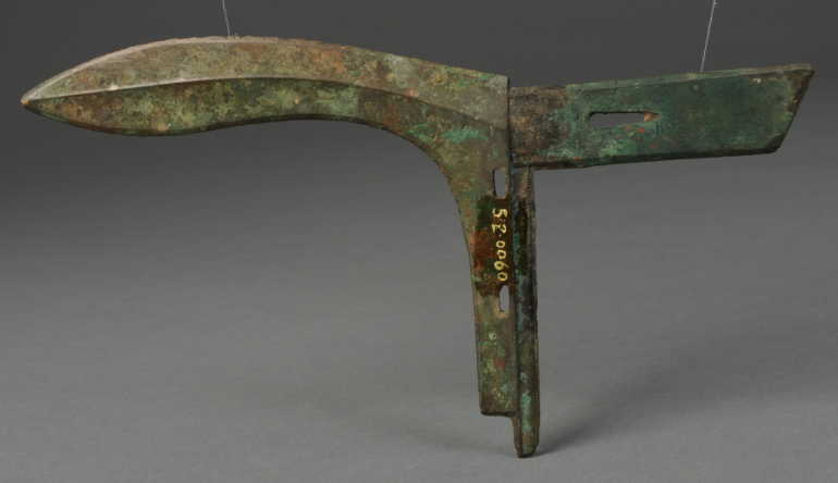 通长26.4厘米、援长16.2厘米、内长10.2厘米。该器内为刀形,三面刃,末端为斜刃,内上一横穿。长胡二穿有下齿,胡上阑侧铭文一行“平阿右,同戟”。“平阿”,齐国地名,“右”,应为(左库)、右库之意,“同”当为冶官或铸造者的名或姓。济南市博物馆在20世纪70年代于济南市物资回收公司废旧物品仓库中拣选得来一批青铜礼器、兵器等。所选铜兵器多数是出土器物,“平阿右,同戟”便是其中一件,其确切出土地点虽不可知,但当时这个公司收购的范围,包括济南的历城及泰安、德州、惠民三地区的一部分,共十八个县,此戟的出土地点当不出这十八个县的地域。此戟据器之自铭,知原物当为刺与戈分铸之戟,刺已脱失,仅存其戈。