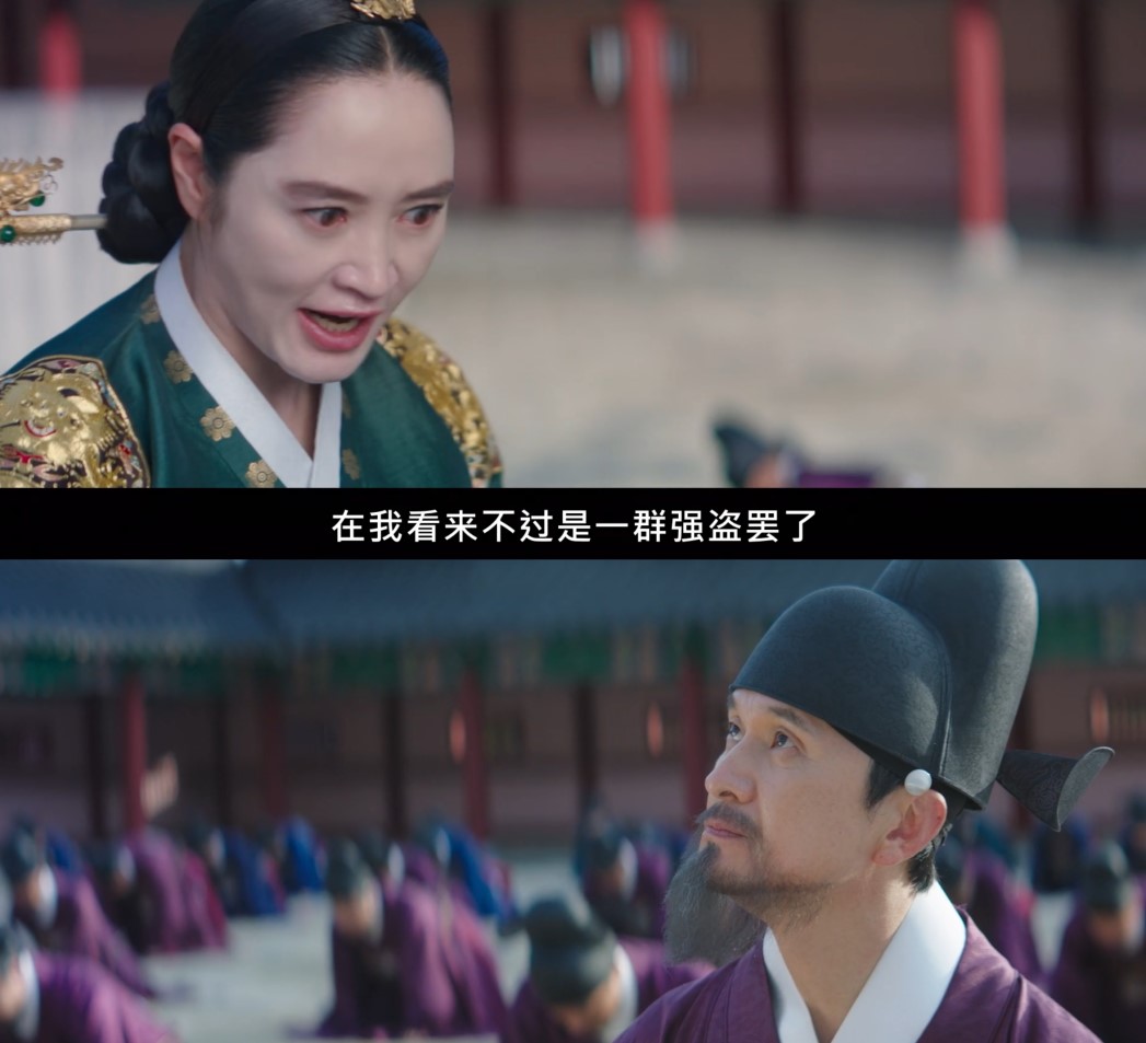 所以,观众还会看到在古代朝鲜社会里不可能发生的事情。比如大臣怒气冲冲冲进大妃的宫殿,质问她,不是答应在夺嫡中帮助自己的外孙吗?你还会看到他嘲讽大妃,“人老了若还贪得无厌,只会显得无耻”。